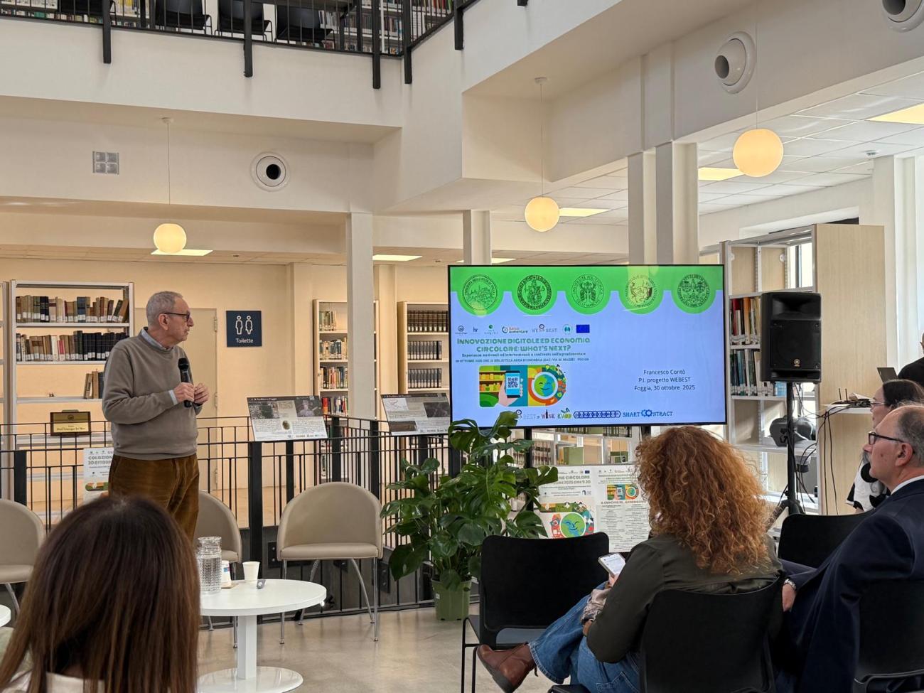 Si è tenuto giovedì 30 ottobre 2025, alle ore 10.00, presso la Biblioteca di Area Econoimca, l'evento multidisciplinare di respiro internazionale “Innovazione digitale ed economia circolare: What's next?”, dedicato alla divulgazione dei risultati e delle prospettive future dei progetti Webest (Wine EVOO Blockchain & Smart Contract) e ERASMUS+ CL4Bio (Creative Learning for Boosting Bio-economy within HEIs’ Curricula), promossi dal Dipartimento di Economia dell’Università di Foggia.