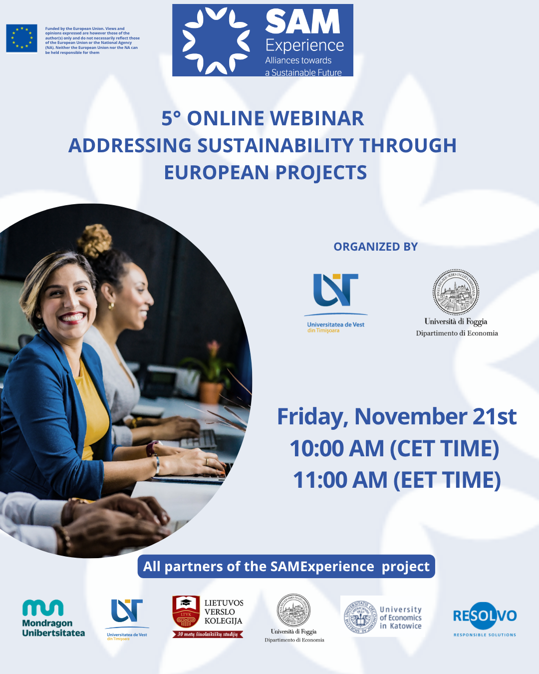 Webinar “Sustainability in European Projects”, organizzato dall’Università di Foggia (UNIFG) e dalla Wrocław University of Technology (WUT) e promosso dal progetto Europeo SAMExperience.